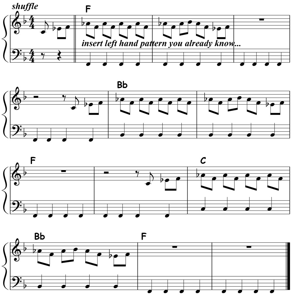 In the key of F… a rhythmic four-bar idea derived from the F Minor Pentatonic Scale… kicked off with a three note pickup into and emphasizing the blue note Me, and incorporating almost two full bars of silence…