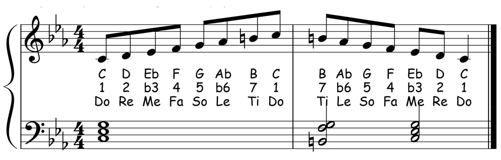 Lesson Goal: To internalize the C Minor Scale (Natural, Melodic, Harmonic)… by ear, intellect, eye, and muscle…