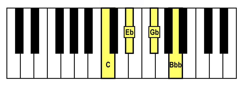 - Spelling = C-Eb-Gb-Bbb (C Diminished Triad + Bbb)