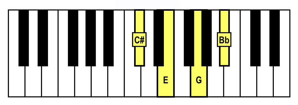 - Spelling = E-G-Bb-Db (E Diminished Triad + Db)