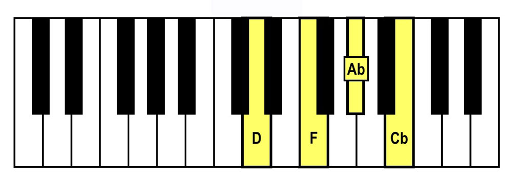 - Spelling = D-F-Ab-Cb (D Diminished Triad + Cb)
