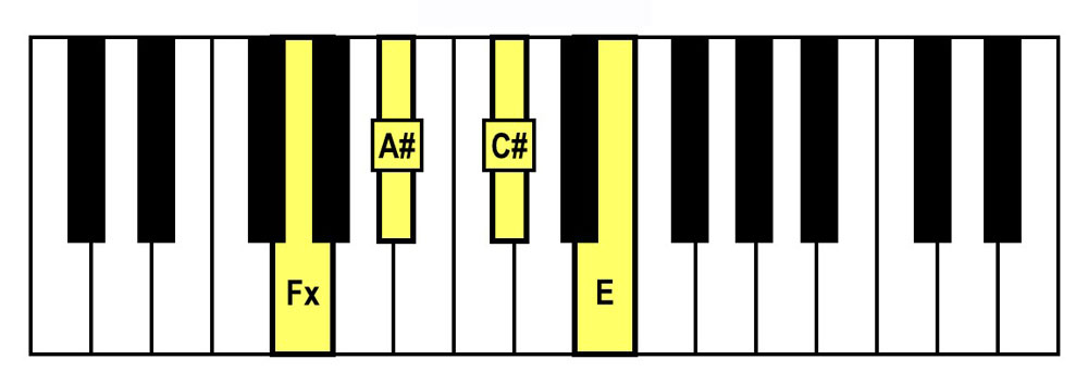 - Spelling = Fx-A#-C#-E (Fx Diminished Triad + E)