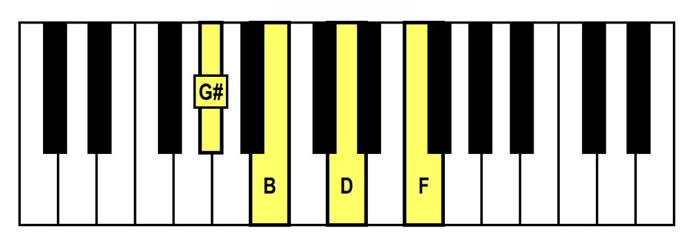 - Spelling = B-D-F-Ab (B Diminished Triad + Ab)