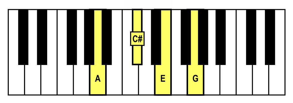 - Spelling: A-C#-E-G (A Major Triad + G)