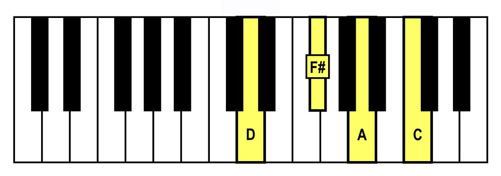 - Spelling: D-F#-A-C (D Major Triad + C)