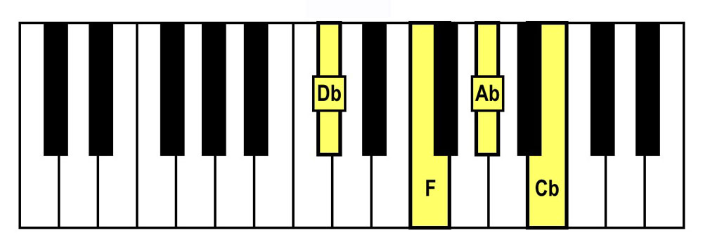 - Spelling: Db-F-Ab-Cb (Db Major Triad + Cb)