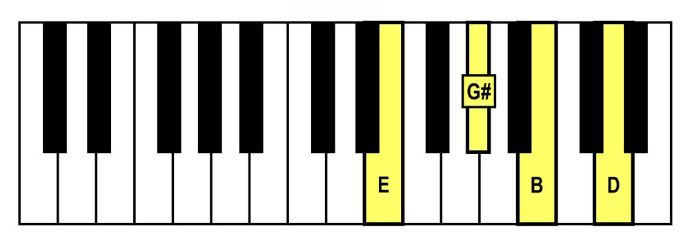 - Spelling: E-G#-B-D (E Major Triad + D)