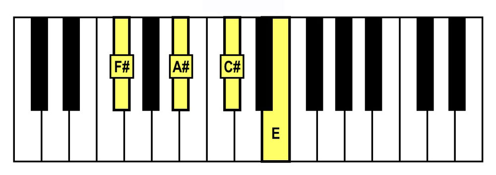 - Spelling: F#-A#-C#-E (F# Major Triad + E)
