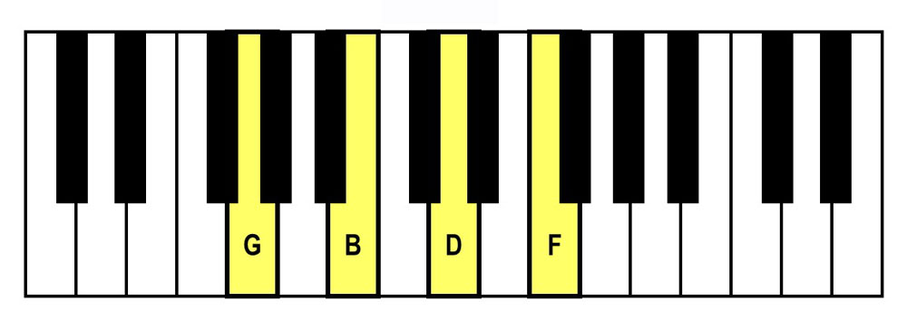 - Spelling: G-B-D-F (G Major Triad + F)