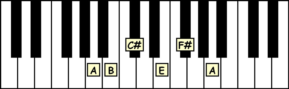 Say this aloud as you read and play: “The A Major Pentatonic Scale is spelled A-B-C#-E-F#-A.”