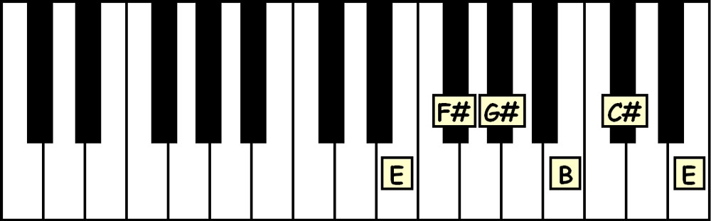 Say this aloud as you read and play: “The E Major Pentatonic Scale is E-F#-G#-B-C#-E.”