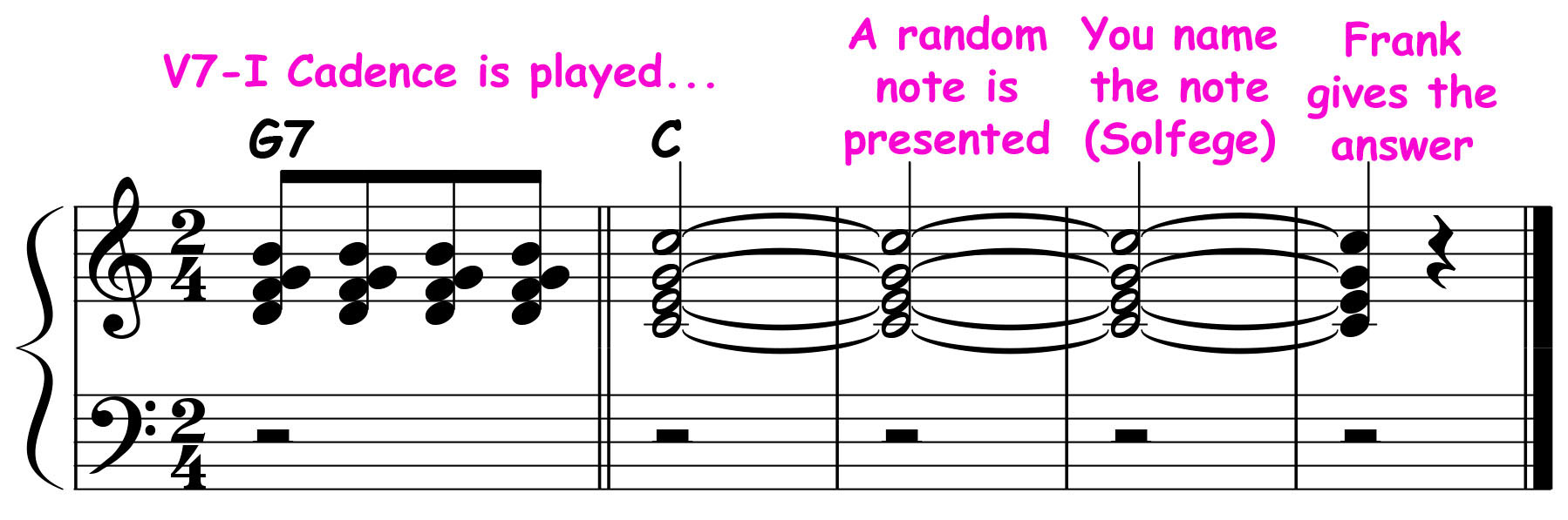 - A G7 to C (V7 to I) cadence is played, clearly establishing the key center and tonality as C Major.
