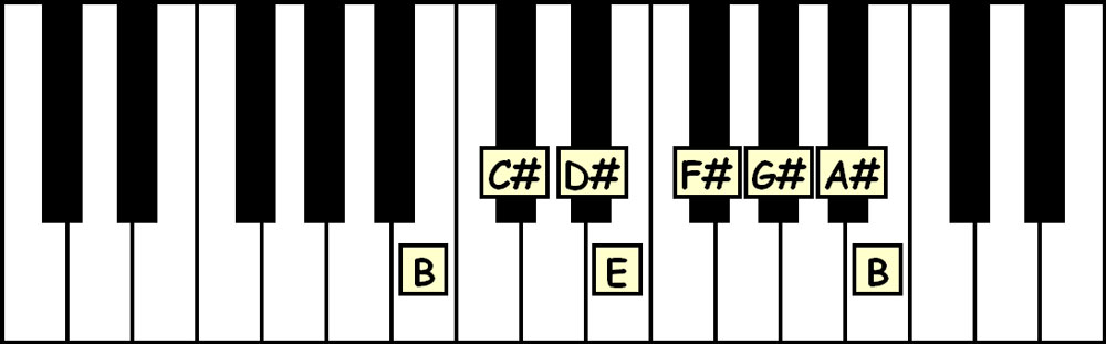 Say this aloud as you read and play: “The B Major Scale is spelled B-C#-D#-E-F#-G#-A#-B.”
