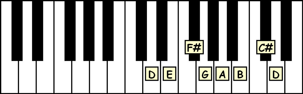 Say this aloud as you read and play: “The D Major Scale is spelled D-E-F#-G-A-B-C#-D.”