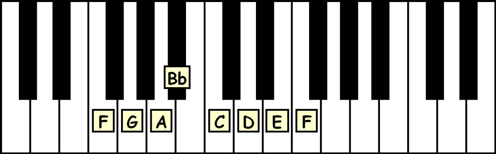 Say this aloud as you read and play: “The F Major Scale is spelled F-G-A-Bb-C-D-E-F.”