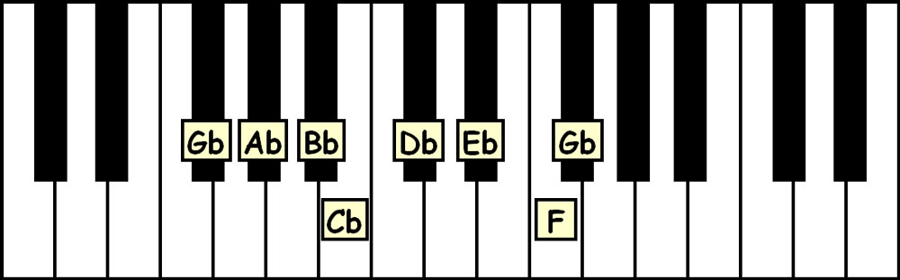 Say this aloud as you read and play: “The Gb Major Scale is spelled Gb-Ab-Bb-Cb-Db-Eb-F-Gb.”