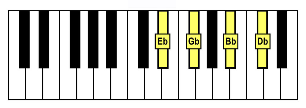 - Spelling: Eb-Gb-Bb-Db (Eb Minor Triad + Db)