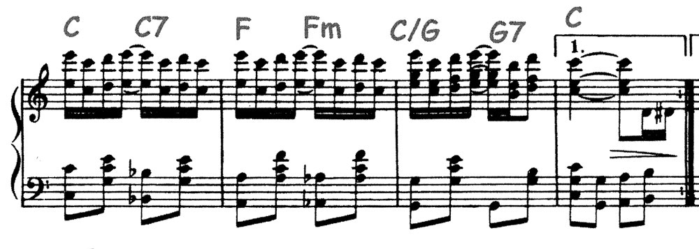 - Chord Progression: [C C7/Bb |F/A Fm/Ab|C/G G| C %]